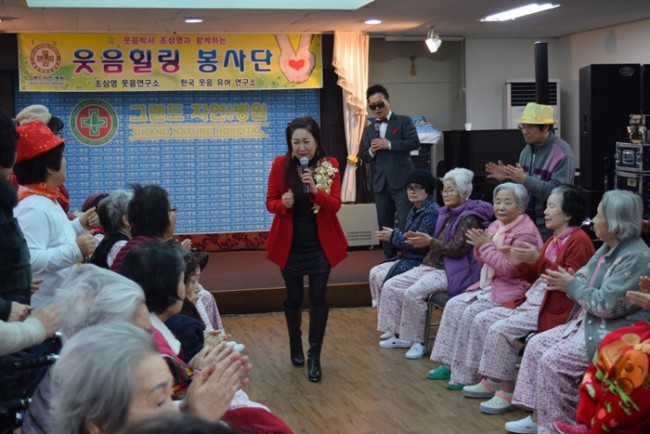 그랜드자연요양병원은 우리 어르신들이 보다 나은 병상생활을 통해 건강해지기 위한 특화 프로그램으로 웃음박사 조상영 교수를 모셔 즐거운 웃음요법을 하고 있다.