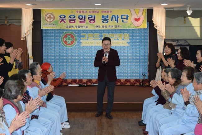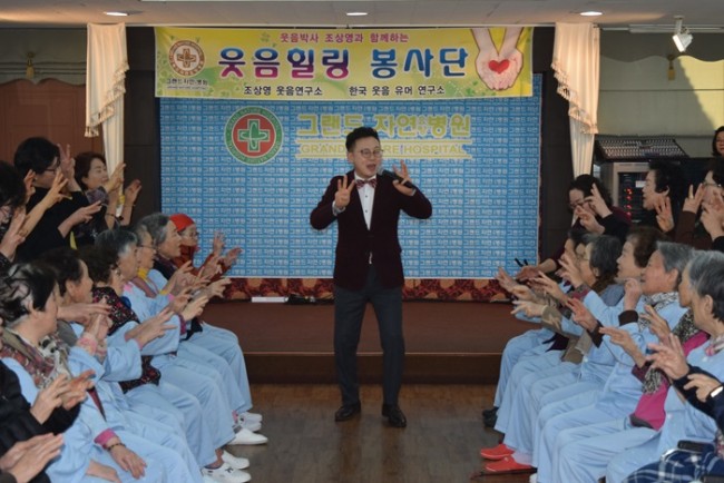 그랜드자연요양병원은 우리 어르신들이 보다 나은 병상생활을 통해 건강해지기 위한 문화 프로그램으로 웃음박사 조상영 교수를 모셔 즐거운 웃음치료를 하고 있다.