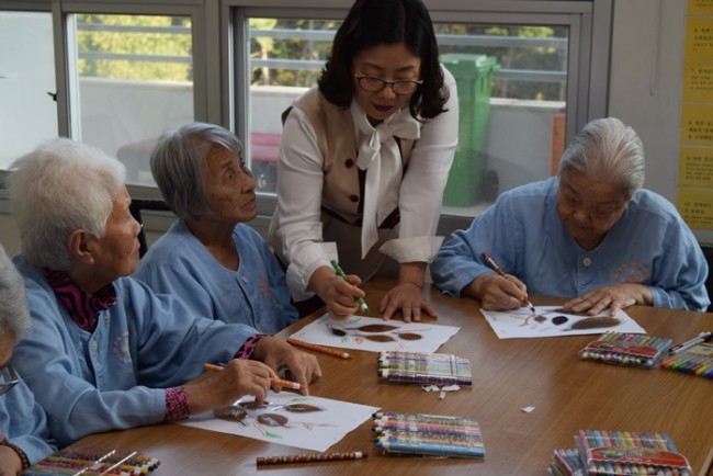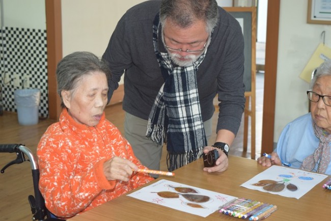 그랜드자연요양병원에서 활용하고 있는 어르신들을 위한 인지재활 전문프로그램중 미술심리치료는 그림으로 어르신들의 마음을 읽는다. <가을 낙엽 꾸미기>를 통해 가을을 느끼며 긍정적 정서를 갖도록 한다.
