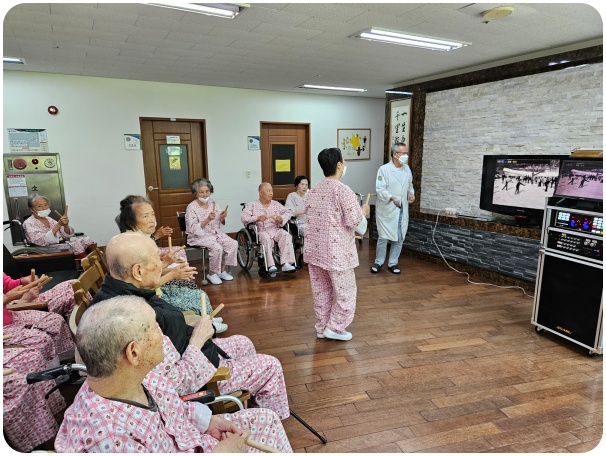 그랜드자연요양병원의 다양한 음악요법 프로그램 중 어르신들이 선호하는 음악활동은 노래부르기(기억 속에 잔존하고 있는 노래를 생각나게 하고 가사를 통해 문자의 기억을 되살려 언어능력의 회복을 기대할 수 있다)이다.