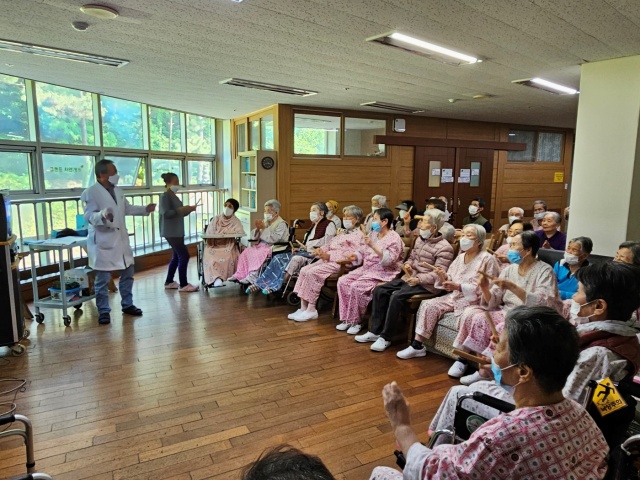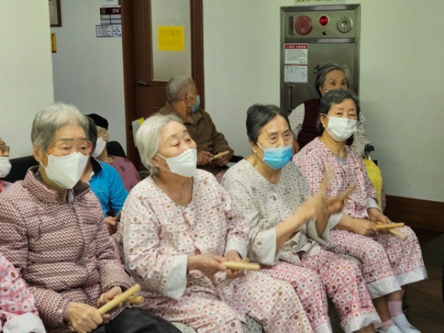 그랜드자연요양병원의 다양한 음악요법 프로그램 중 어르신들이 선호하는 음악활동은 노래부르기(기억 속에 잔존하고 있는 노래를 생각나게 하고 가사를 통해 문자의 기억을 되살려 언어능력의 회복을 기대할 수 있다)이다.