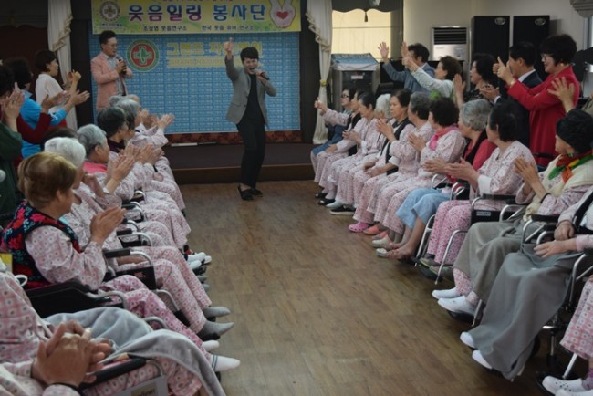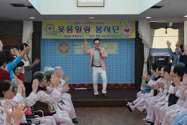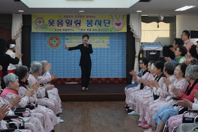그랜드자연요양병원은 우리 어르신들이 보다 나은 병상생활을 통해 건강해지기 위한 특화 프로그램으로 웃음박사 조상영 교수를 모셔 즐거운 웃음요법을 하고 있다.