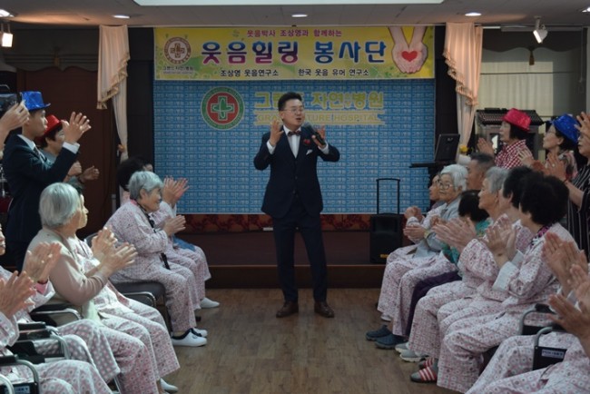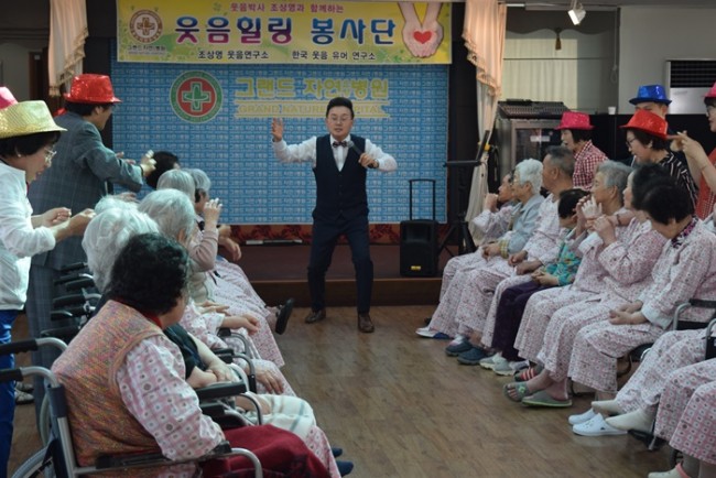그랜드자연요양병원은 우리 어르신들이 보다 나은 병상생활을 통해 건강해지기 위한 특화 프로그램으로 웃음박사 조상영 교수를 모셔 즐거운 웃음요법을 하고 있다.