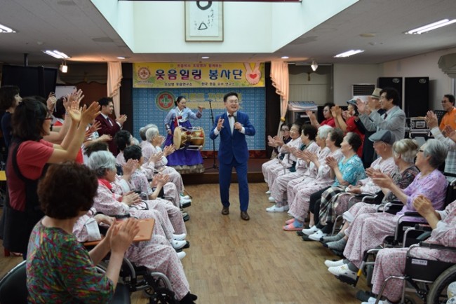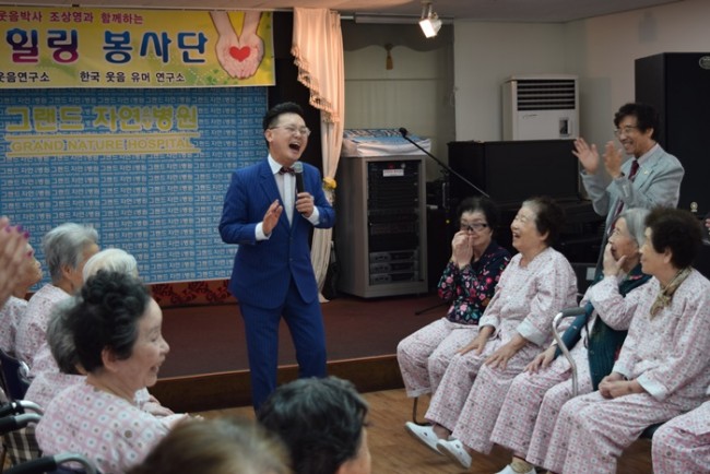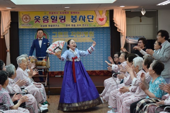 그랜드자연요양병원은 우리 어르신들이 보다 나은 병상생활을 통해 건강해지기 위한 특화 프로그램으로 웃음박사 조상영 교수를 모셔 즐거운 웃음요법을 하고 있다.