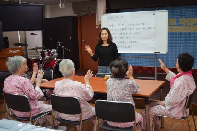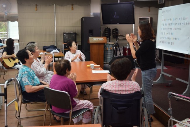 그랜드자연요양병원은 어르신들을 대상으로 <치료적 노래만들기와 부르기> <악기 연주하기> <음악 회상하기> <움직이기/ 춤추기> <음악 감상하기> 등 음악의 사용으로 삶의 질을 향상시키고, 음악요법 활동에 참여함으로 상호작용과 사회적 의사소통의 참여도를 높이며 긍정적 경험을 통하여 심리적 안정을 얻고자 한다.